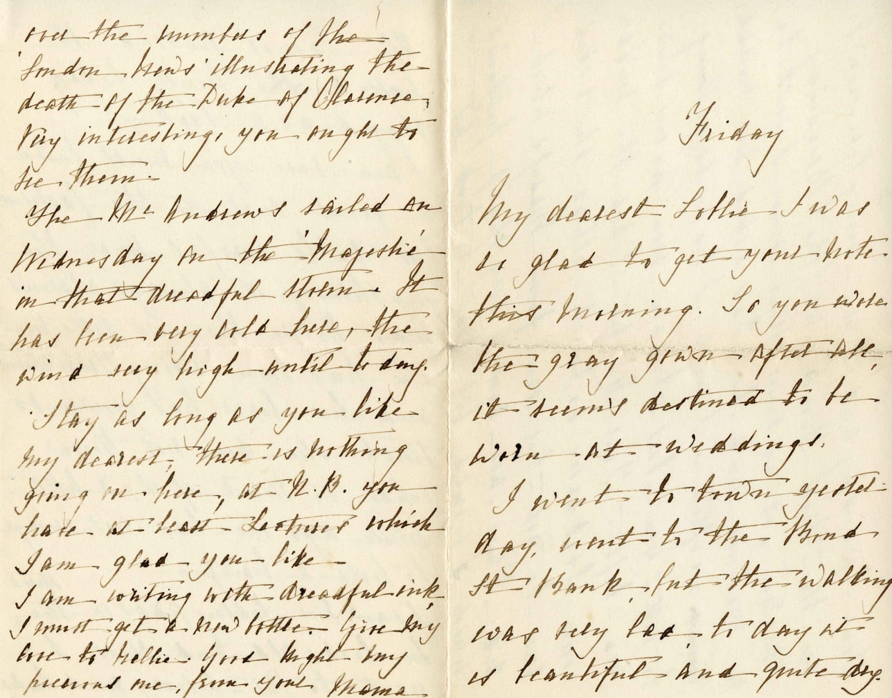 @austen_family_papers_misc_corr -> about -> [@victorian_social_life, @photography_business]over the numbers of the 'London News' illustrating the death of the Duke of Clarence; very interesting; you ought to see them. The McAndrews sailed on Wednesday in the 'Majestic' in that dreadful storm. It has been very cold here, the wind very high until today. Stay as long as you like my dearest. There is nothing going on here, at R.P. you have at least lectures which I am glad you like. I am writing with dreadful ink. I must get a new bottle. Give my love to Lottie; you might say precious me, from your Mama. Friday My dearest Lottie - I was so glad to get your note this morning. So you wrote the gray gown after all, it seems destined to be worn at weddings. I went to town yesterday, went to the Pond St Bank, but the walking was very bad, today it is beautiful and quite dry.