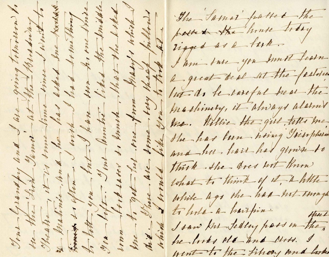 Your Grandpa and I are going tomorrow to see the 'Little James' but the weather being so bad, it is time time since I went to St. Malonic, and he has asked me several times to go to him. I wish I had something to tell you, but I have seen his one quite you left. Your Auntie liked the knitted bonnet, look saves so much, that she wished me to get her one from Granny which I did. These are some very cheap pillbox which I would like you to think of. The 'Samoi' passed the post in the house today rigged as a fish. I am sure you must learn a great deal at the festivals not do be careful near the machinery, it always almost kills me. Willie the girl tells me she has been using Trisphim and her hair has grown to thick she does not know what to think of it, a little while ago she has not enough to hold a hairpin. I saw Mr. Sedley pass in the, he looks old and stiff. I went to the library and looked