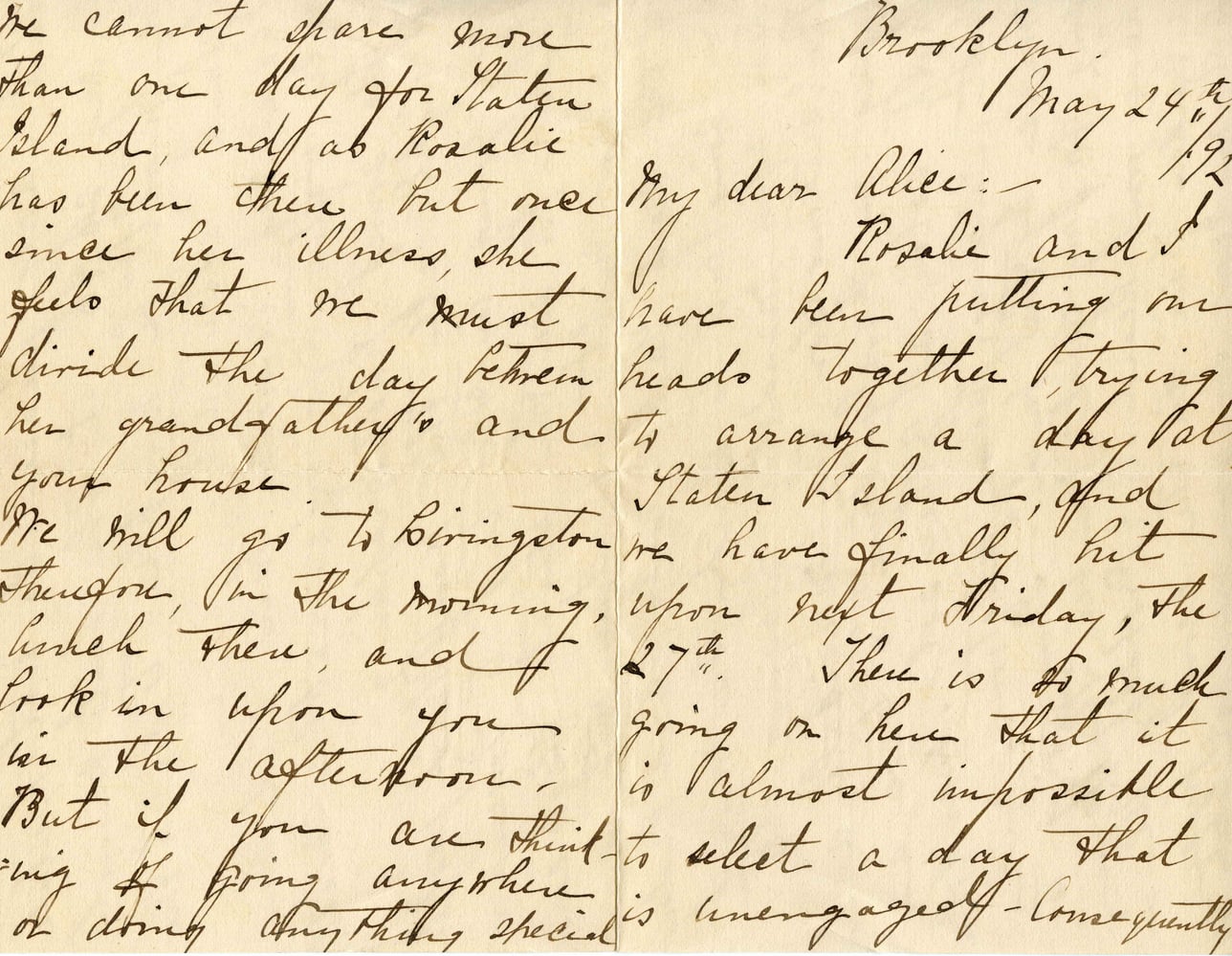Brooklyn. May 24th, 1892 My dear Alice: Rosalie and I have been putting our heads together, trying to arrange a day for Staten Island, and we have finally hit upon next Friday, the 27th. There is so much going on here that it is almost impossible to select a day that is unengaged—consequently We cannot spare more than one day for Staten Island, and as Rosalie has been there but once since her illness, she feels that we must divide the day between her grandfather's and your house. We will go to Livingston Thursday, in the morning, lunch there, and if look in upon you in the afternoon. But if you are thinking of doing anything special