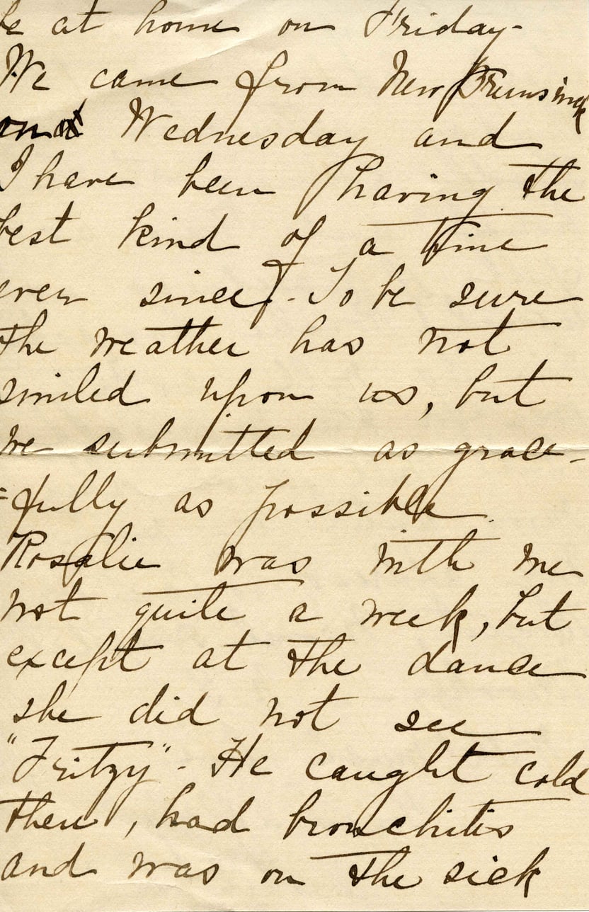 We came from New Brunswick on Wednesday and I have been having the best kind of a time ever since. To be sure the weather has not smiled upon us, but we submitted as gracefully as possible. Prolie was with me not quite a week, but except at the dance she did not see "Fritz". He caught cold there, had bronchitis and was on the sick