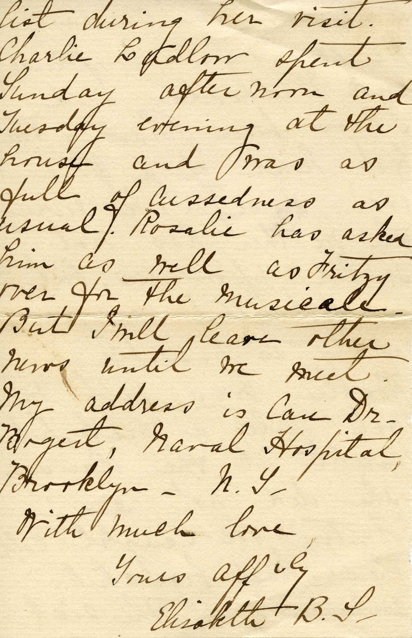 list during her visit. Charlie & fellow spent Sunday afternoon and Tuesday evening at the house and I was as full of lassedness as usual. Rosalie has asked him as well as Fritz over for the musical. But I will leave other news until we meet. My address is Can Dr. Bregent, Naval Hospital, Brooklyn - N.Y. With much love Yours affly, Elizabeth B.L.