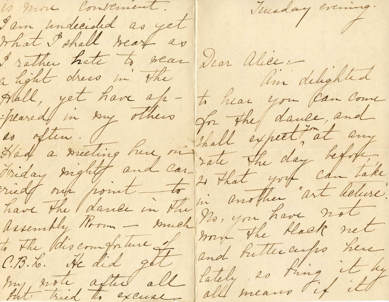 Tuesday evening. Dear Alice: I am delighted to hear you can come for the dance, and shall expect you at any rate the day before, so that you can take in another "art lecture." No, you have not seen the black net and butter cups here lately, so bring it by all means if it is more convenient. I am undecided as yet what I shall wear as I rather hate to wear a light dress in the Hall, yet have appeared in my others so often. Had a meeting here on Friday night and carried our point—to have the dance in the Assembly Room—much to the discomfort of C.B.L. He did get my vote after all but tried to excuse