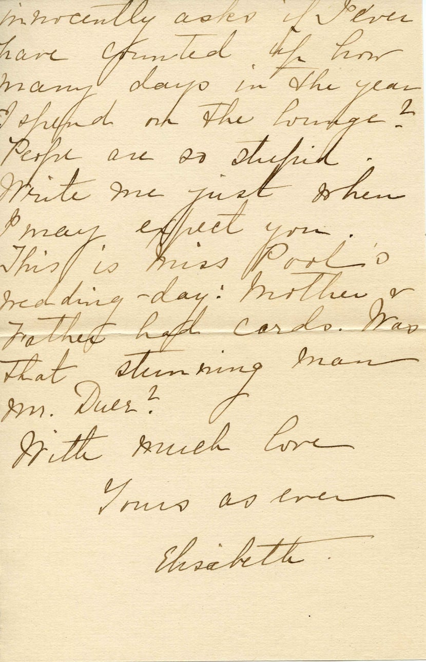 innocently asks if I ever have counted up how many days in the year I slept on the lounge? People are so stupid. Write me just when & may expect you. This is Miss Pool's wedding-day: Mother & Father had cards. Was that stunning man Mr. Duer? With much love Yours as ever Elizabeth