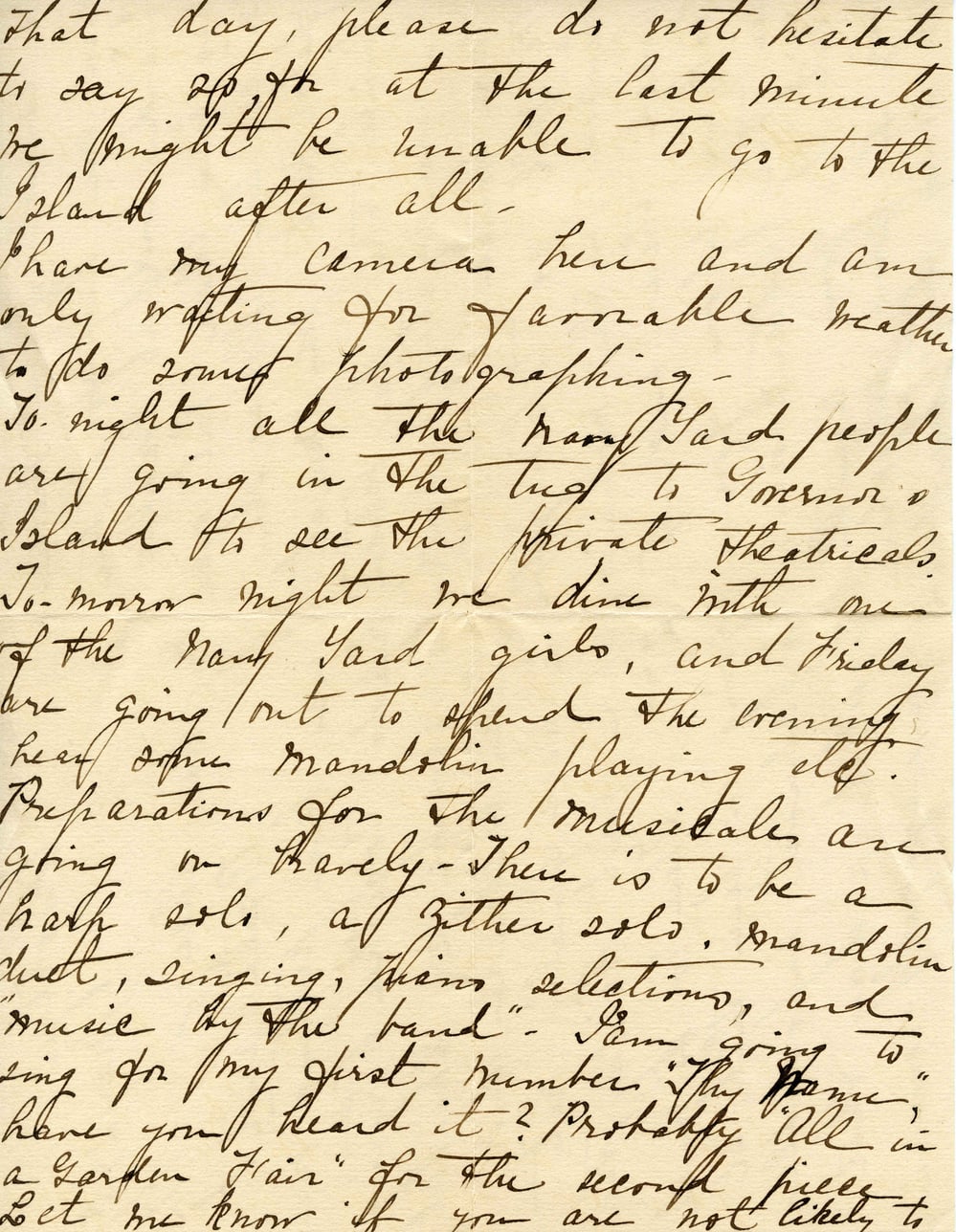 That day, please do not hesitate to say of you at the last minute we might be unable to go to the Island after all. I have my camera here and am only waiting for favorable weather to do some photographing. To-night all the Navy Yard people are going in the tug to Governor's Island to see the private theatricals. To-morrow night we dine with one of the Navy Yard girls, and Friday we're going out to spend the evening here before mandolin playing etc. Preparations for the melodramas are going on bravely. There is to be a half solo, a fiddler solo, mandolin duet, singing, piano selections, and "music by the band." I am going to sing for my first number "My Name," have you heard it? Probably "All in a Garden Fair" for the second piece. Let me know if you are not likely to