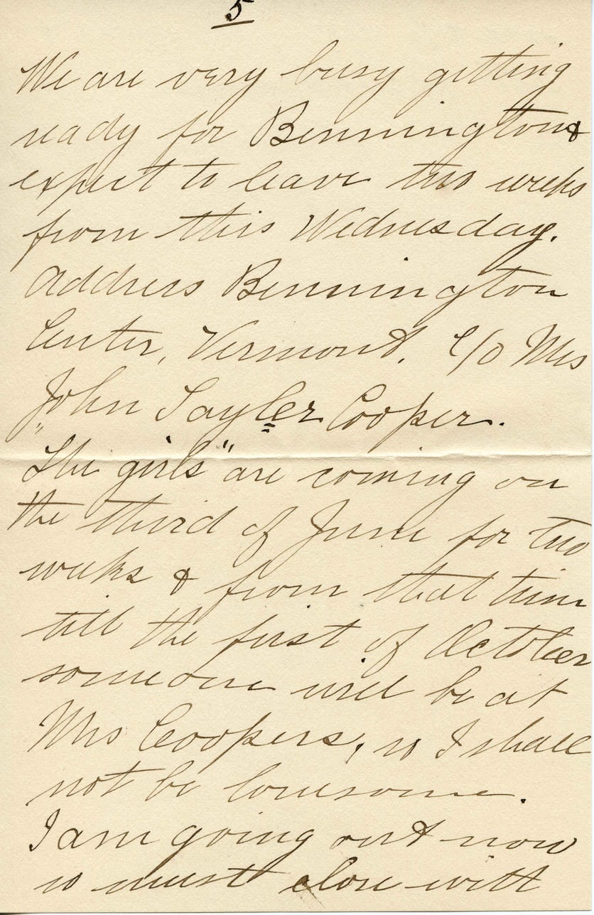 We are very busy getting ready for Bennington. Expect to leave this week from this Wednesday. Address Bennington Center, Vermont, c/o Mrs John Sayler Cooper. The girls are coming over the third of June for two weeks & from that time till the first of October someone will be at Mrs Coopers, so I shall not be lonesome. I am going out now to dust alone—with
