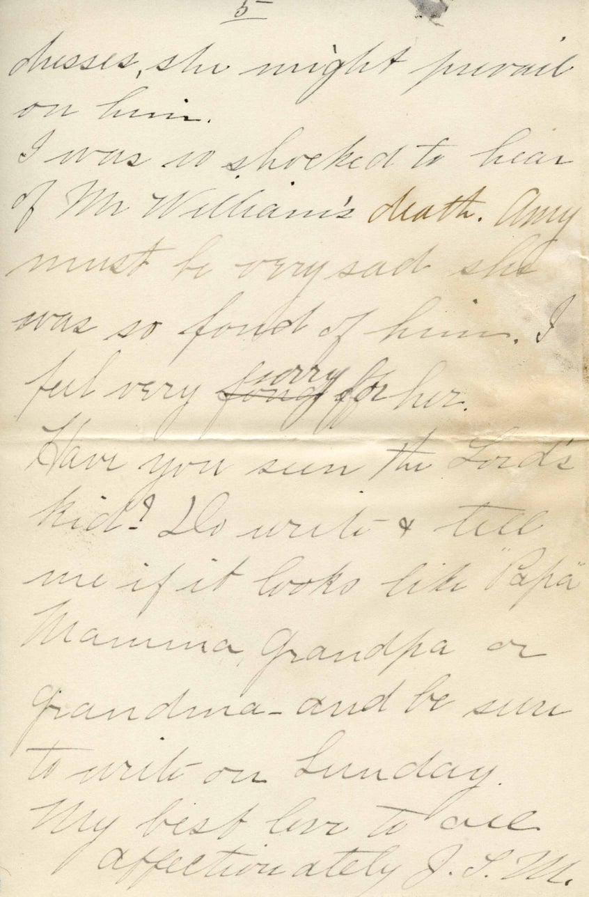 dresses, she might prevail on him. I was so shocked to hear of Mr. William's death. Amy must be very sad she was so fond of him. I feel very sorry for her. Have you seen the Lord's kid? Do write & tell me if it looks like Papa, Mamma, Grandpa or Grandma—and be sure to write on Sunday. My best love to all. Affectionately J.E.W.