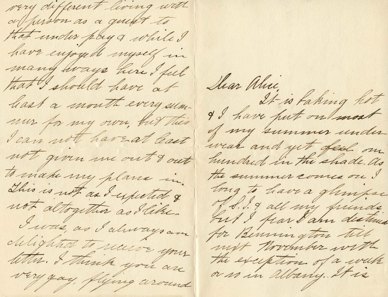 very different living with a person as a guest to that under pay & while I have enjoyed myself in many ways here I feel that I should have at least a month every summer for my own, but this I can not have at least not given me out & out to make my plans in. This is not as I expected & not altogether as I like. I was, as I always am delighted to receive your letter. I think you are very gay, flying around Dear Alice, It is taking hot & I have put on most of my summer underwear and yet feel on hundred in the shade. As the summer comes on I long to have a glimpse of S.I. & all my friends but I fear I am destined for Bennington till next November with the exception of a week or so in Albany. It is