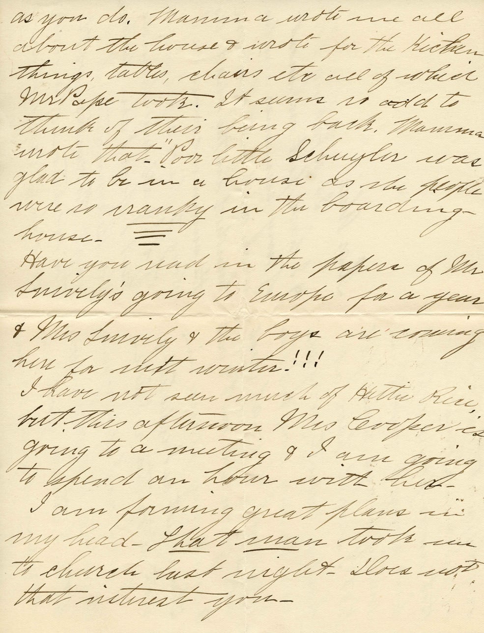as you do. Mamma wrote me all about the house & wrote for the kitchen things, tables, chairs etc all of which Mr Pope took. It seems so odd to think of their being back. Mamma wrote that "Poor little Schuyler was glad to be in a house! So the people were so cranky in the boarding house." Have you read in the papers of Mr Sively's going to Europe for a year & Mrs Sively & the boys are coming here for next winter!!! I have not seen much of Arthur Rice, but this afternoon Mrs Cooper is going to a meeting & I am going to spend an hour with her. I am forming great plans in my head. That man took me to church last night. Does not that interest you?