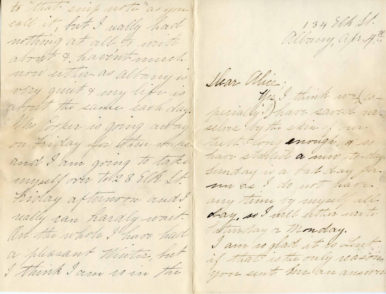 @julia_t_martin -> plans to travel to -> @staten_island {date: @date_1892_05_16, reason: "visit friends"}to "that snip note" as you call it, but I really had nothing at all to write about & haven't much now either as Albany is very quiet & my life is about the same each day. Mrs Cooper is going away on Friday for three weeks and I am going to take myself over to 23 Elk St. Friday afternoon and I really can hardly wait. And the whole I have had a pleasant winter, but I think I am so in the 134 Elk St. Albany, Apr. 4th Dear Alice: Yes I think we (particularly) have saved ourselves by the skin of our teeth long enough, & so have started a new today. Sunday is a bad day for me as I do not have any time by myself all day, so I will either write Saturday or Monday. I am so glad it is Lent if that is the only reason you sent me an answer