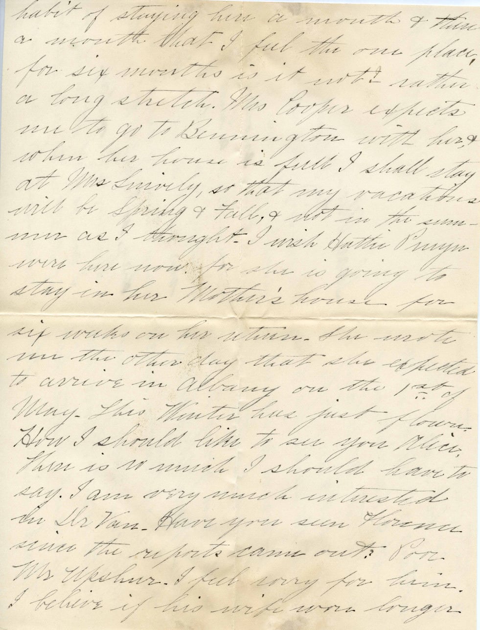 habit of staying here a month & then a month that I feel the one place for six months is it not? rather a long stretch. Mrs Cooper expects me to go to Bennington with her, when her house is full. I shall stay at Mrs Smiley, so that my vacations will be spring & fall, & not in the summer as I thought. I wish Hattie Pragn were here now, for she is going to stay in her Mother's house for six weeks on her return. She wrote me the other day that she expected to arrive in Albany on the 1st of May. This winter has just flown. How I should like to see you Alice. There is so much I should have to say. I am very much interested in Mr Van. Have you seen Florence since the reports came out? Poor Mr Upshur. I feel sorry for him. I believe if his wife were longer