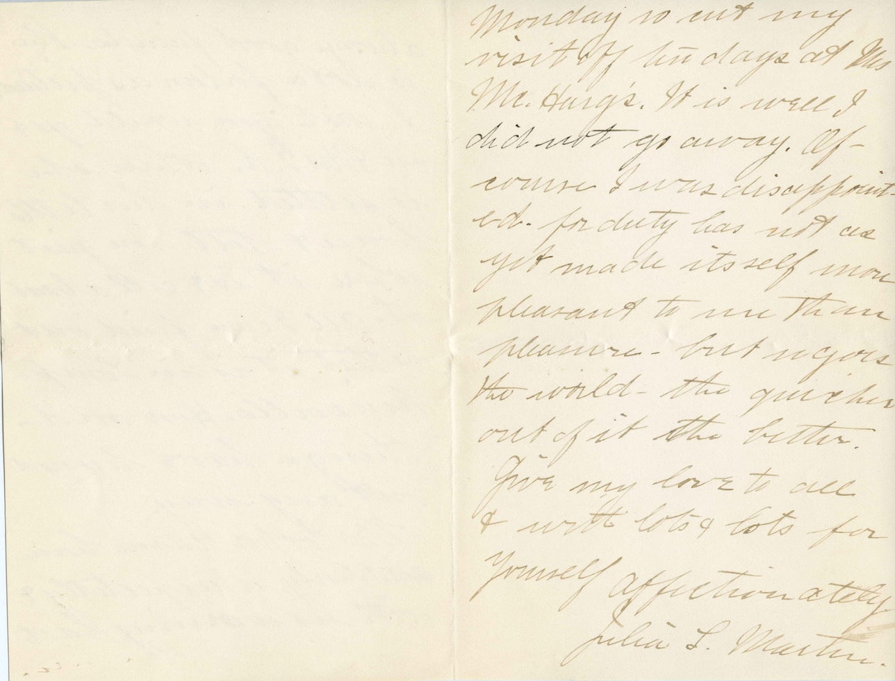 Monday so cut my visit off ten days at Mr. Hargis's. It is well I did not go away. Of course I was disappointed, for duty has not as yet made itself more pleasant to me than pleasure—but vigorous the world—the quicker out of it the better. Give my love to all & with lots & lots for yourself affectionately Julia L. Martin