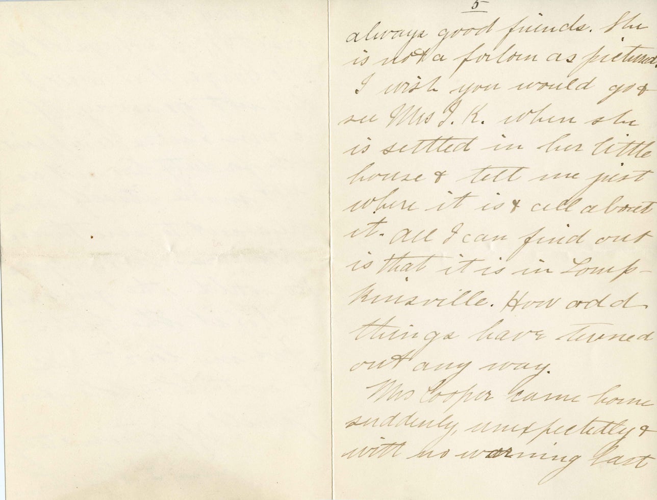 always good friends. She is not as forlorn as pictured. I wish you would go & see Mrs. J.K. when she is settled in her little house & tell me just where it is & all about it. All I can find out is that it is in Lumpkinville. How odd things have turned out any way. Mrs. Cooper came home suddenly unexpectedly & with no warning last