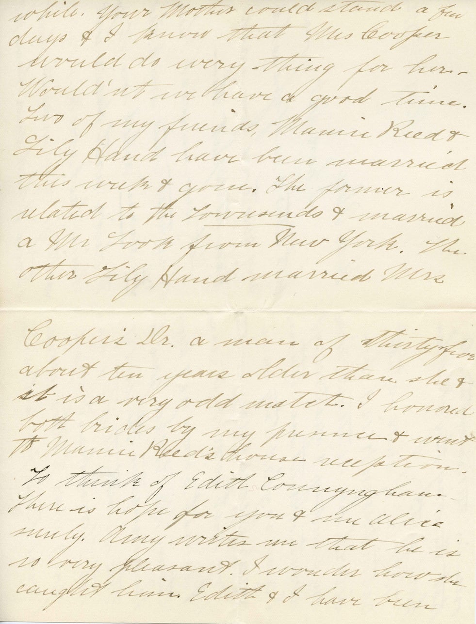 while, your Mother could stand a few days & I know that Mrs. Cooper would do everything for her. Wouldn't we have a good time. Two of my friends, Maumie Reed & Lily Hand have been unmarried this week & you. The former is related to the Townsend & married a Mr. Took from New York. The other Lily Hand married Mr. Cooperis Jr., a man of thirty-four about ten years older than she & it is a very odd match. I honored both brides by my presence & went to Maumie Reed's house reception. To think of Edith Convery having there is hope for you & me alike surely. Amy writes me that he is so very pleasant. I wonder how she caught him. Edith & I have been