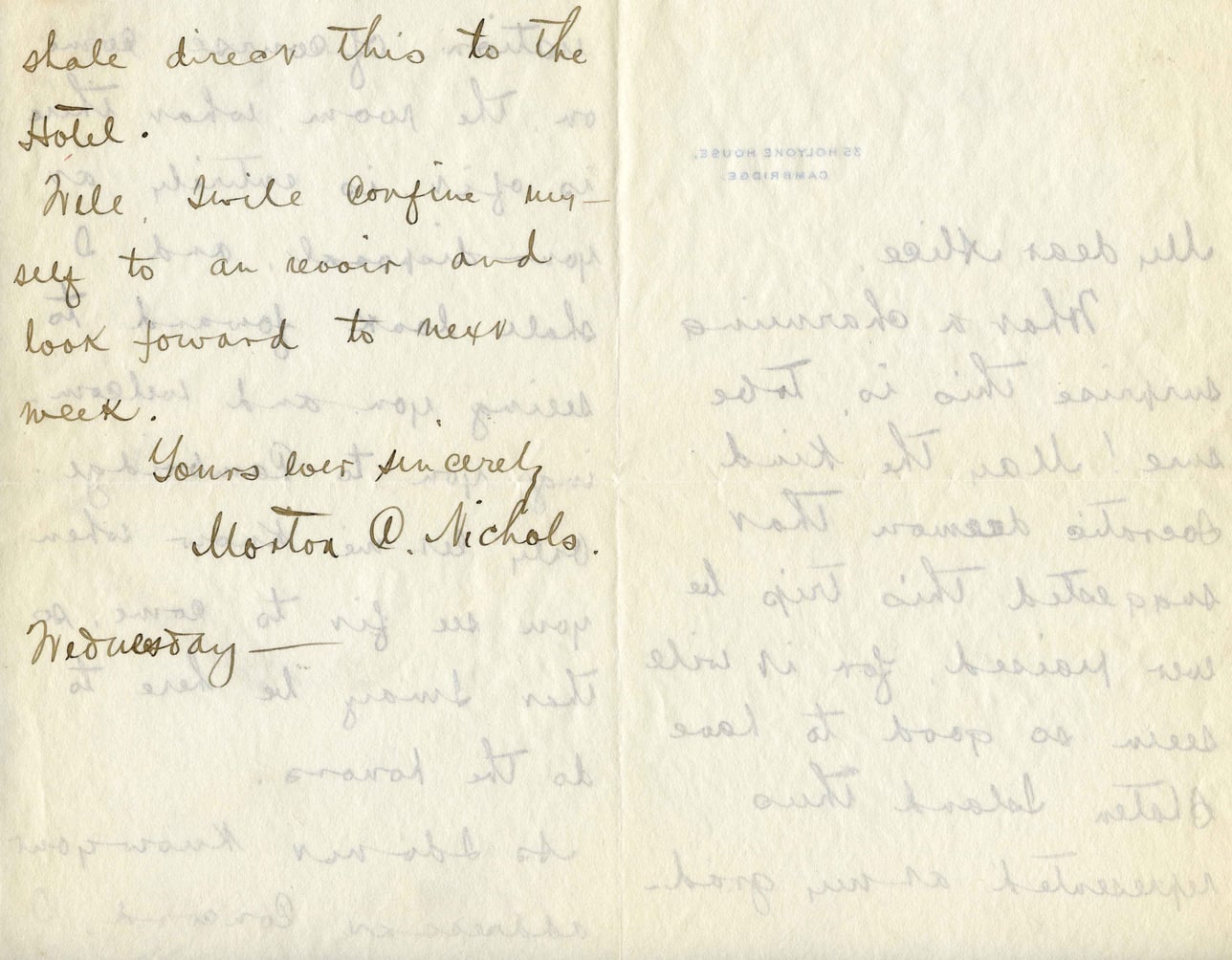 shall direct this to the Hotel. Well, I will confine myself to an essay and look forward to next week. Yours ever sincerely, Morton D. Nichols. Wednesday