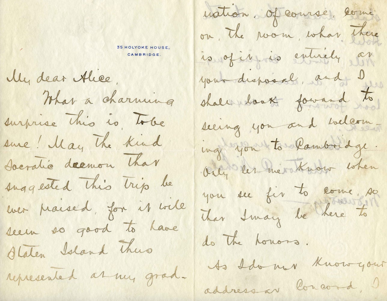 @file_1892_6_june_4003_nichols_copy_jpg -> contains -> @letter_1892_06_0235 HOLYOKE HOUSE, CAMBRIDGE. My dear Alice, What a charming surprise this is, to be sure! May the kind Socratic daemon that suggested this trip be ever praised, for it will seem so good to have Staten Island thus represented at my graduation. Of course, some of the room, what there is of it, is entirely at your disposal, and I shall look forward to seeing you and welcoming you to Cambridge. Only let me know when you see fit to come, so that I may be here to do the honors. As I do not know your address at Concord, I