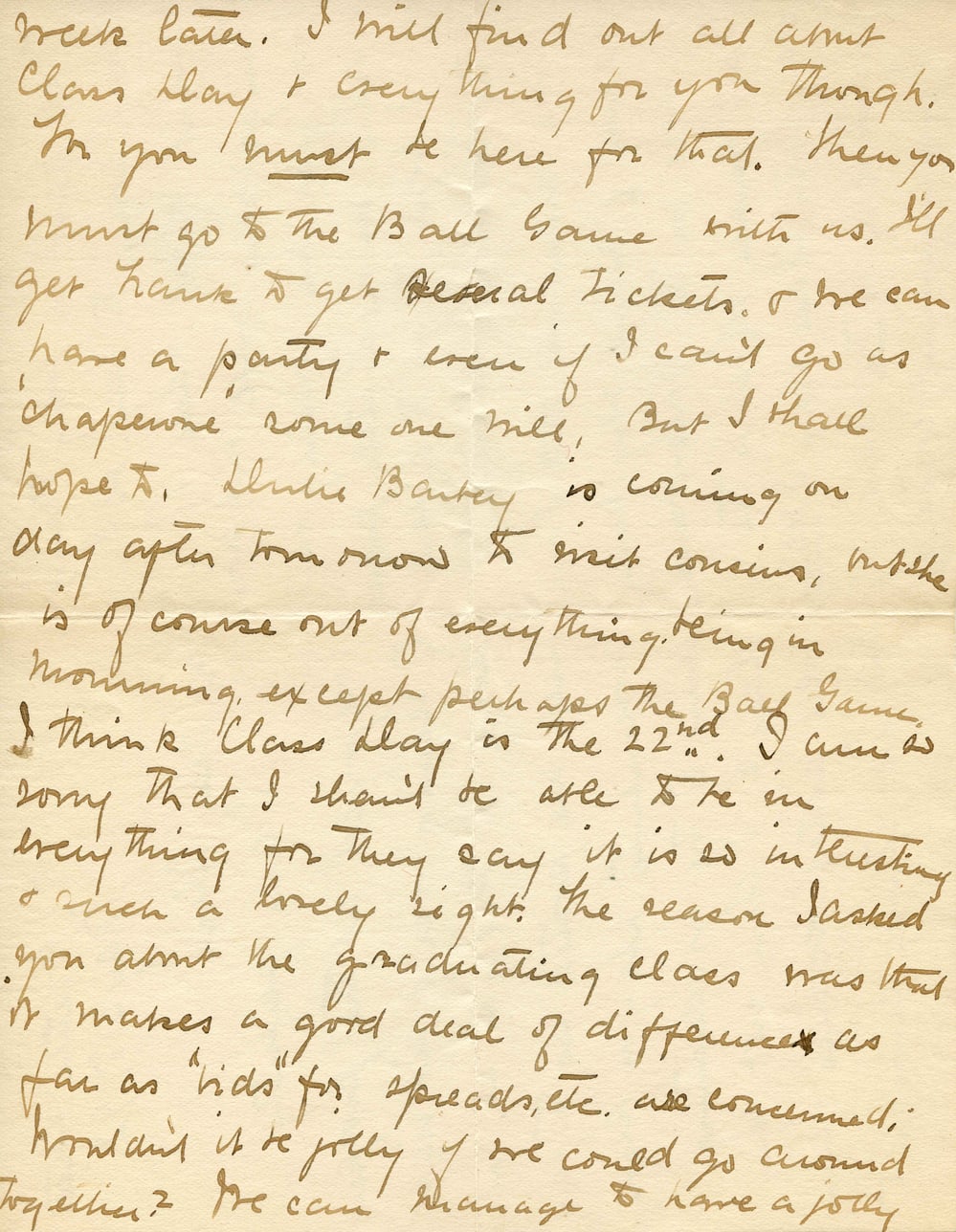 week later. I will find out all about Class Play & everything for you though. You must be here for that. Then you must go to the Ball Game with us. I'll get Frank to get several tickets, & we can have a party & even if I can't go as 'chaperone' someone will! But I shall hope to. Minnie Barney is coming on day after tomorrow to visit cousins, but she is of course out of everything, being in morning, except perhaps the Ball Game. I think Class Play is the 22nd. I am so sorry that I shouldn't be able to be in everything for they say it is so interesting & such a lovely sight. The reason I asked you about the graduating class was that it makes a good deal of difference as far as "kids" for spreads, etc. are concerned. Wouldn't it be jolly if we could go around together? We can manage to have a jolly