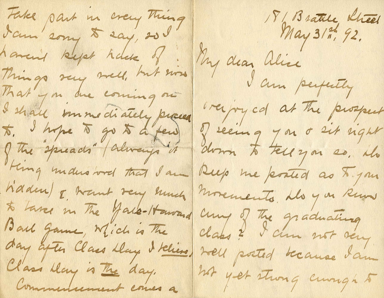 @file_1892_5_31_may_10002_lou_copy_jpg:file {type: "image", ocr: true}Take part in everything I am sorry to say, so I haven't kept track of things very well, but now that you are coming on I shall immediately proceed to. I hope to go to a few of the "spreads" (always it being understood that I am hidden) & want very much to take in the Yale-Howard Ball game, which is the day after Class Day. I believe Class Day is the day. Commencement comes a 181 Brattle Street May 31st, 92. My dear Alice, I am perfectly overjoyed at the prospect of seeing you & sit right down to tell you so. Do keep me posted as to your movements. Also you know any of the graduating class? I am not very well posted because I am not yet strong enough to
