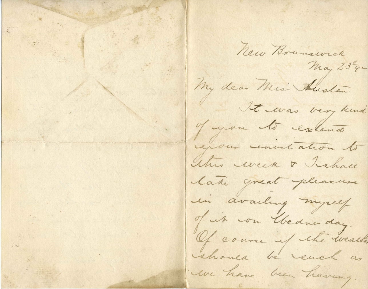 New Brunswick May 23rd My dear Miss Austen, It was very kind of you to extend your invitation to this week & I shall take great pleasure in availing myself of it on Wednesday. Of course if the weather should be such as we have been having.