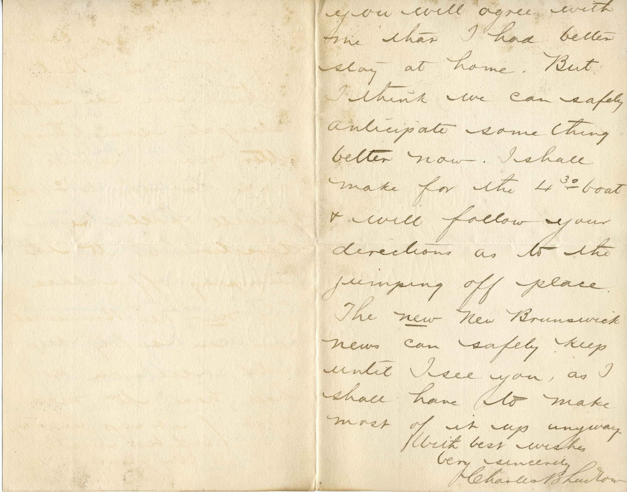 you will agree with me that I had better stay at home. But I think we can safely anticipate something better now. I shall make for the 4 3rd boat & will follow your directions as to the jumping off place. The new New Brunswick news can safely keep until I see you, as I shall have to make most of it up anyway. With best wishes, Very sincerely, Charles B. Hurd