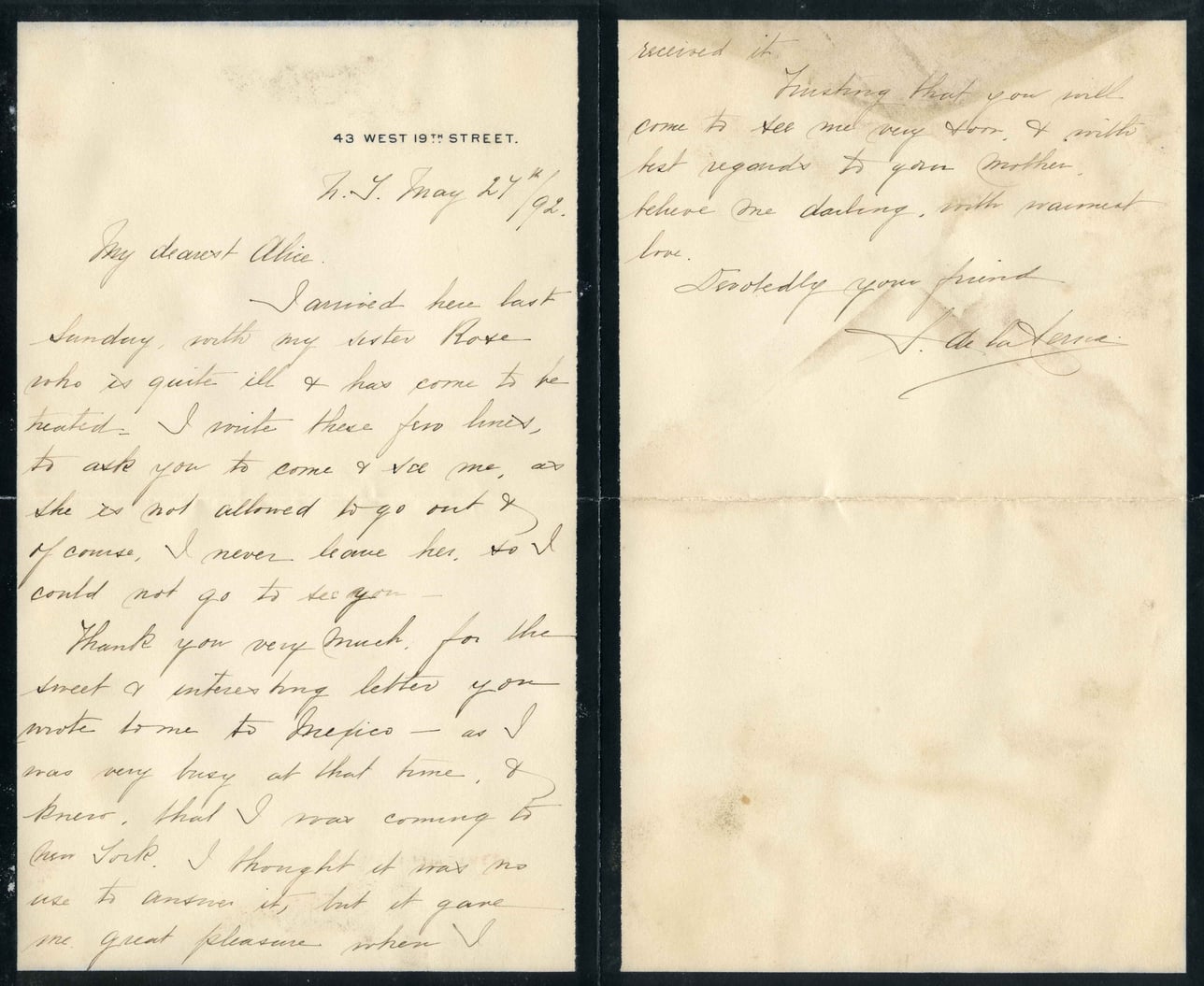 43 WEST 19TH STREET. W.T. May 27th, 1902. My dearest Alice, I arrived here last Sunday, with my sister Rose who is quite ill & has come to be treated. I write these few lines, to ask you to come & see me, as she is not allowed to go out & of course, I never leave her, so I could not go to see you. Thank you very much for the sweet & interesting letter you wrote to me to Greece—as I was very busy at that time, & knew, that I was coming to New York. I thought it was no use to answer it, but it gave me great pleasure when I received it. Hoping that you will come to see me very soon, & with best regards to your mother. Believe me darling, with profound love. Trulyly your friend, J. A. La Femme