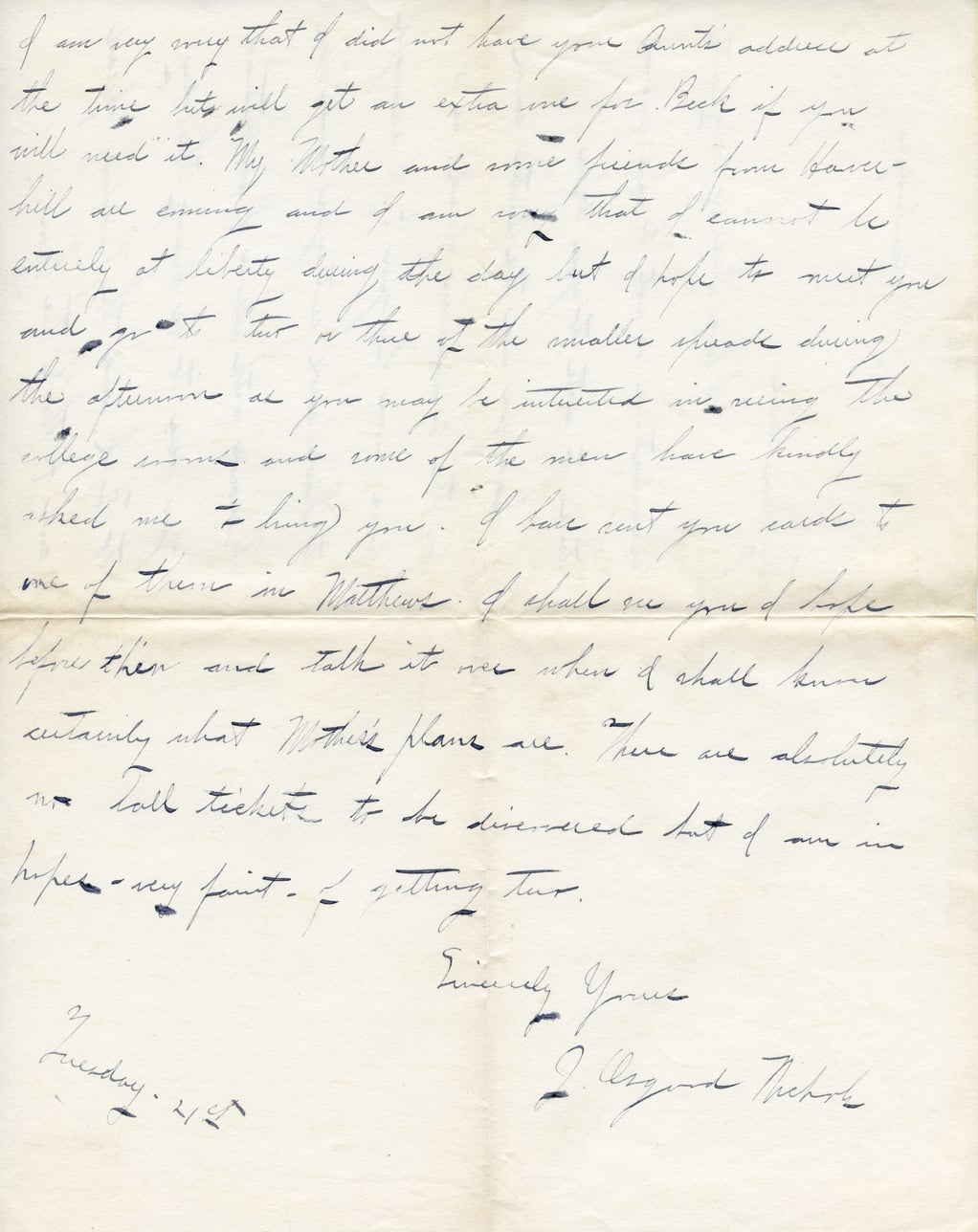 I am very sorry that I did not have your Aunt's address at the time but will get an extra one for Beck if you will need it. My Mother and some friends from Harshill are coming and I am sure that I cannot be entirely at liberty during the day but I hope to meet you and go to two of the smaller spreads during the afternoon as you may be interested in seeing the college work and some of the men have kindly asked me to bring you. If have sent you cards to one of them in Matthews. I shall see you & hope before then and talk it over when I shall know certainly what Mother's plans are. There are absolutely no tall tickets to be discovered but I am in hopes—very faintly—of getting two. Sincerely Yours, J. Lloyd Nichols 21st Monday