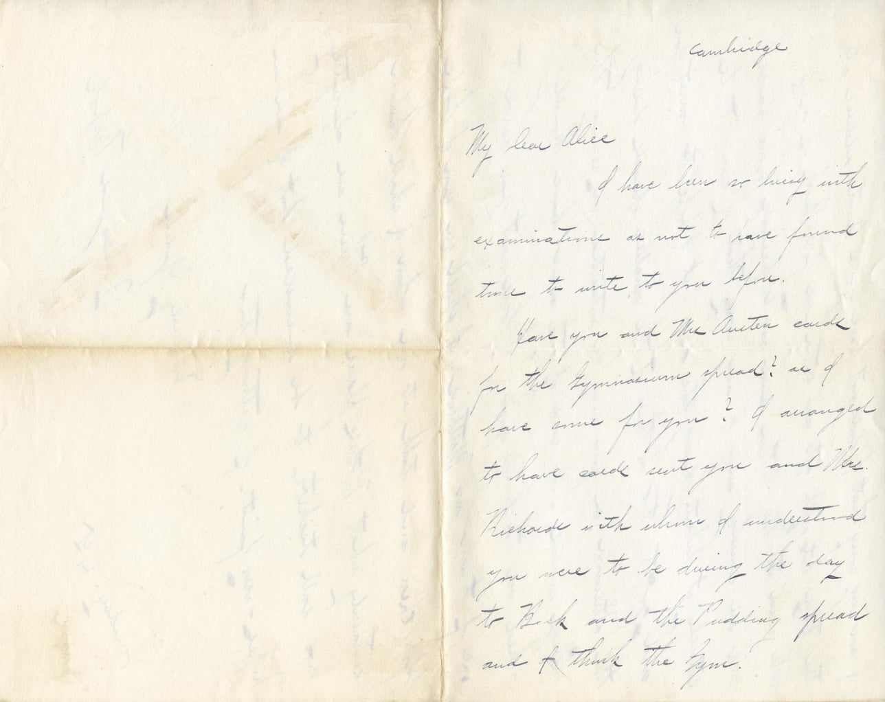 @j_osgood_nichols -> hoped to obtain -> @two:concept {type: "tickets"}Cambridge My dear Alice, I have been so busy with examinations as not to have found time to write to you before. Have you and Mrs. Austen cards for the Gymnasium spread? As I have none for you? I arranged to have cards sent you and Mrs. Richards with whom I understood you were to be during the day to Beck and the Pudding spread and to thank the Gym.