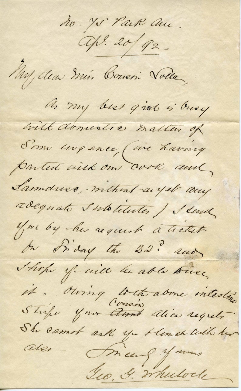 @george_wheelock -> sent -> @ticket {when: @date_1892_04_20, recipient: @miss_cousin_dolla}No. 75 Park Ave. Apr. 20/92 My dear Miss Cousin Dolla, As my best girl is busy with domestic matters of some consequence, (we having parted with our cook and lamdries, without any adequate substitutes) I send you by her request a ticket for Friday the 22? and I hope if will be able to use it. Owing to the above intestino cousin strife your Aunt Alice regrets she cannot ask you to lunch with her also. Sincerely yours, Geo. G. Whelock