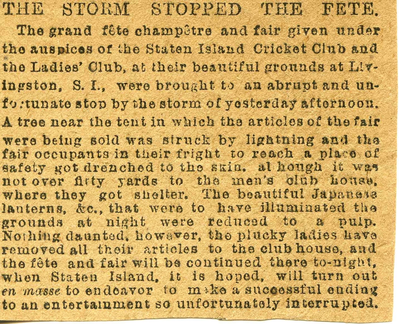 @file_1892_6_29_june_10002_copy_jpg -> describes -> @fete_champetreTHE STORM STOPPED THE FETE. The grand fête champêtre and fair given under the auspices of the Staten Island Cricket Club and the Ladies' Club, at their beautiful grounds at Livingston, S. I., were brought to an abrupt and unfortunate stop by the storm of yesterday afternoon. A tree near the tent in which the articles of the fair were being sold was struck by lightning and the fair occupants in their fright to reach a place of safety got drenched to the skin, although it was not over fifty yards to the men's club house, where they got shelter. The beautiful Japanese lanterns, &c., that were to have illuminated the grounds at night were reduced to a pulp. Nothing daunted, however, the plucky ladies have removed all their articles to the club house, and the fête and fair will be continued there to-night, when Staten Island, it is hoped, will turn out en masse to endeavor to make a successful ending to an entertainment so unfortunately interrupted.