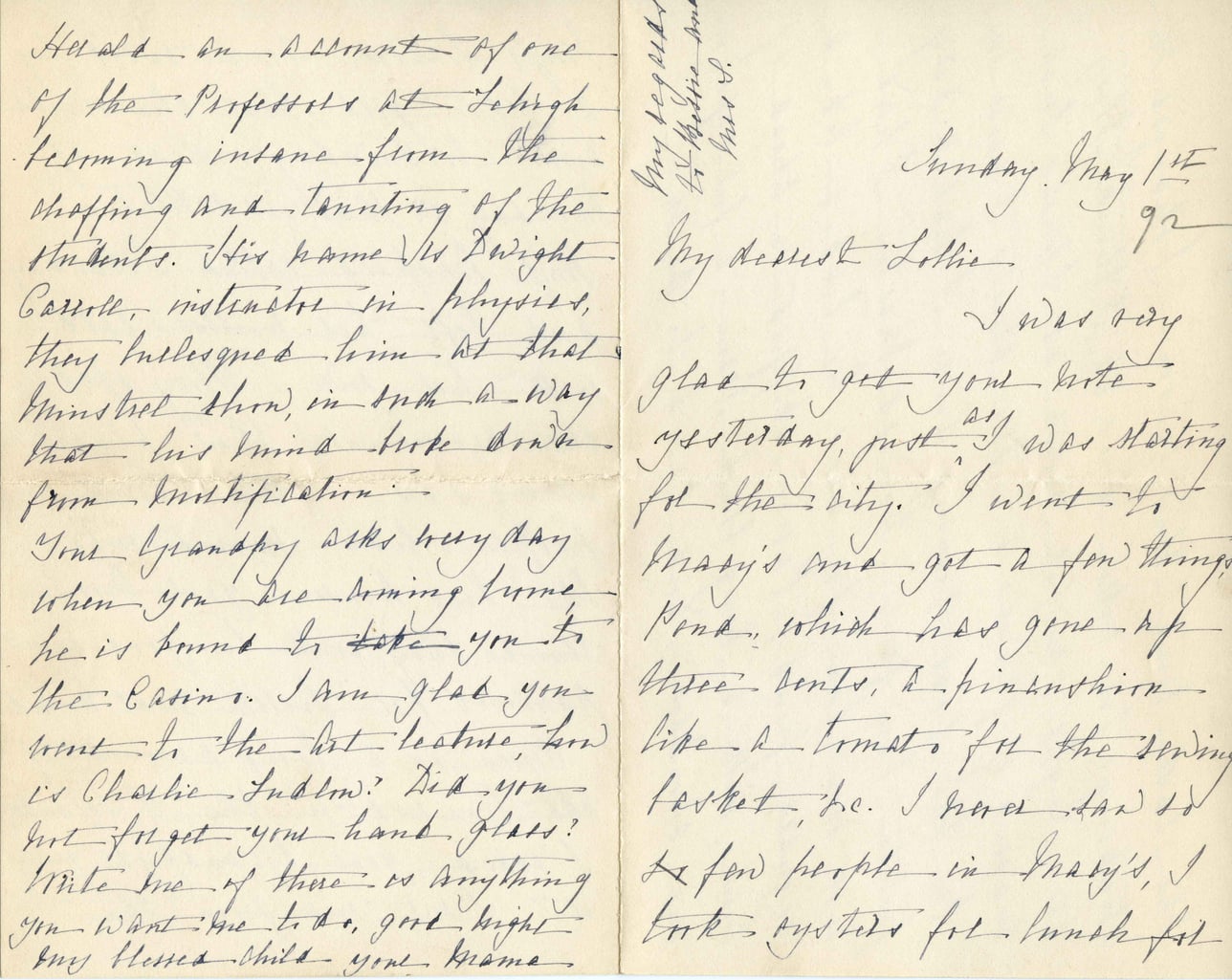 Heads on account of one of the Professors at Lehigh becoming insane from the shouting and taunting of the students. His name is Dwight Carroll, instructor in physics, they lislequed him at that Minstrel show, in such a way that his mind broke down from mortification. Your Grandpa asks every day when you are coming home, he is going to take you to the Casino. I am glad you went to the Art lecture, how is Charlie Ludlow? Did you just forget your hand glass? Write me of there or anything you want me to do, good night My blessed child yours, Sunday May 1st 92 My dearest Lottie, I was very glad to get your note yesterday, just as I was starting for the city. I went to Masay's and got a few things, Pond, which has gone up three cents, a pinanthion like a tomato for the sewing basket, etc. I never saw so few people in Masay's, I took oysters for lunch for