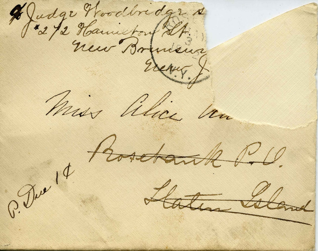 Judge Woodbridge & 272 Hamilton St. New Brunswick N.J. Miss Alice Van Prosehank P.L. Long Island P. Due 1¢