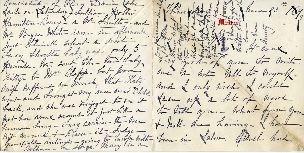 @letter_1892_06_23_minny_to_alice -> signed by -> @minnie {date: @date_1899_06_28}Consisted of Thora Davis. She came on Saturday—Julian, Mother—Hamilton, Larry, & Mr. Smith—and Mr. Bryce White came in afterwards, just think what a visit Lucy Short's baby was only 5 pounds. We sent the two baby Kittys to Mrs. Chapp—but poor Rip suffered so much, that Katy went and brought my niece Alice's child back, and she was overjoyed to see it put her arms around it just like a human being—Lucy carried the live bird around & kissed it—Indie—Greenfield visiting—going to Emily with Mother—the stage Mary is— June 28th 1899 Minnie It was very good of you to write me a note all to myself—and I only wish I could clean up a lot of news to tell you—what fun you & I will be having—I have been in Salem, which had