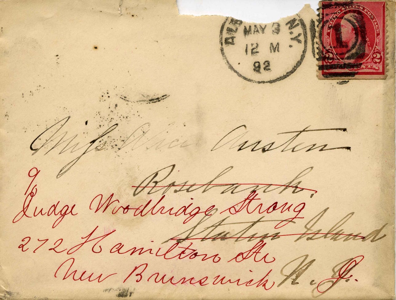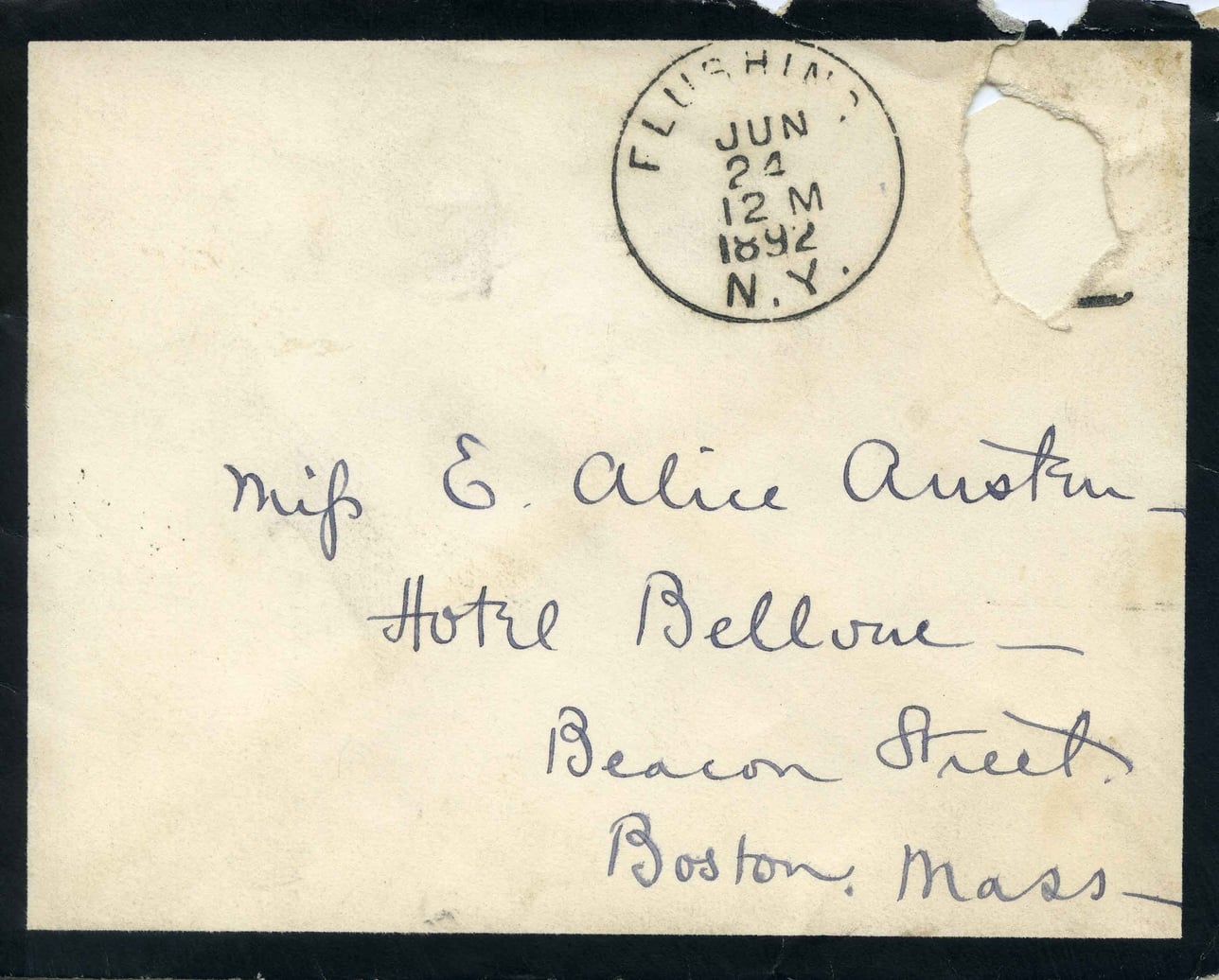 @austen_family_papers_envelopes:collection {title: "Austen Family Papers: Envelopes and Addresses Collection", creator: @alice_austen, institution: "Alice Austen House", created: @date_1892, language: "en", subjects: ["Correspondence","Envelopes","Addresses","Victorian-era social practices","Family history","Staten Island"], description: "Envelope images and addresses from the Austen Family Papers, primarily from 1892, showing social connections and correspondence networks of Alice Austen and her family."}