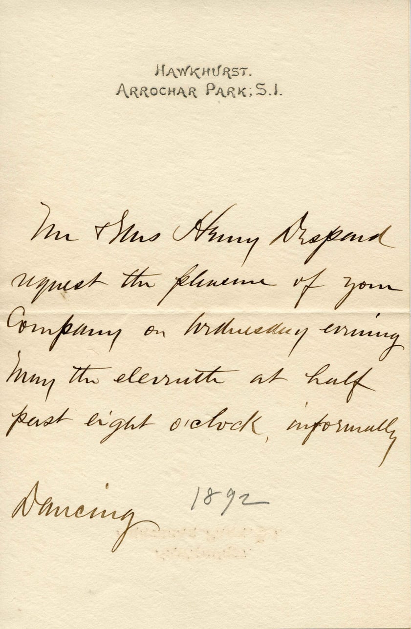 @constance_bonner -> daughter of -> @edward_h_bonnerHAWKHURST. ARROCHAR PARK, S.I. Mr & Mrs Henry Dresland request the pleasure of your Company on Wednesday evening May the eleventh at half past eight o'clock, informally Dancing 1892
