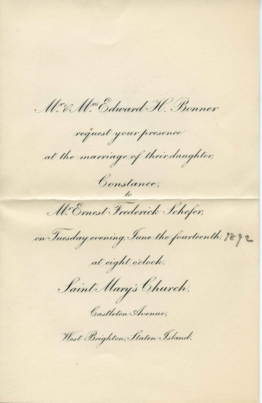 Mr. & Mrs. Edward H. Bonner request your presence at the marriage of their daughter, Constance, to Mr. Ernest Frederick Schofer, on Tuesday evening, June the fourteenth, 1892 at eight o'clock. Saint Mary's Church, Castleton Avenue, West Brighton, Staten Island.