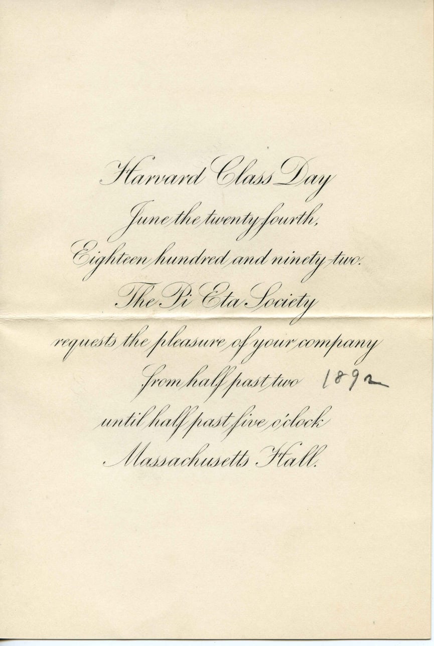 Harvard Class Day June the twenty-fourth, Eighteen hundred and ninety-two. The Pi Eta Society requests the pleasure of your company from half past two 1892 until half past five o'clock Massachusetts Hall.