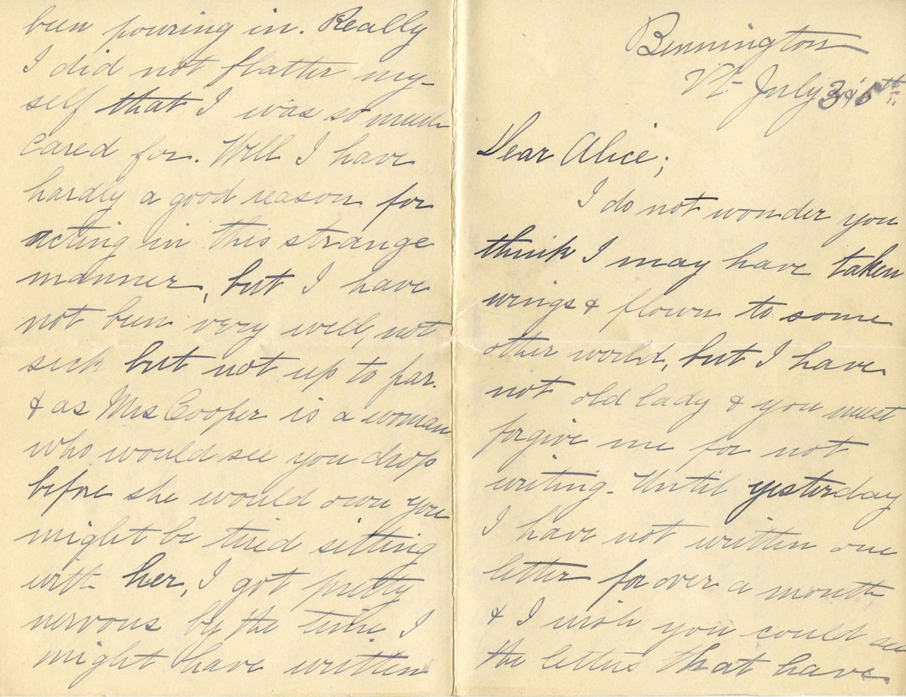 @worlds_columbian_exposition:event -> referenced in -> [@trude_eccelston, @elizabeth_lynch, @mary_l_hayes, @helen_constance_randall, @alice_austen]Benningson VII July 31st Dear Alice; I do not wonder you think I may have taken wings & flown to some other world, but I have not old lady & you must forgive me for not writing. Until yesterday I have not written one letter for over a month & I wish you could see the letters that have been pouring in. Really I did not flatter myself that I was so much cared for. Will I have hardly a good reason for acting in this strange manner, but I have not been very well, not sick but not up to par. & as Mrs Cooper is a woman who would see you drop before she would own you might be tired sitting with her, I got pretty nervous by the time I might have written.