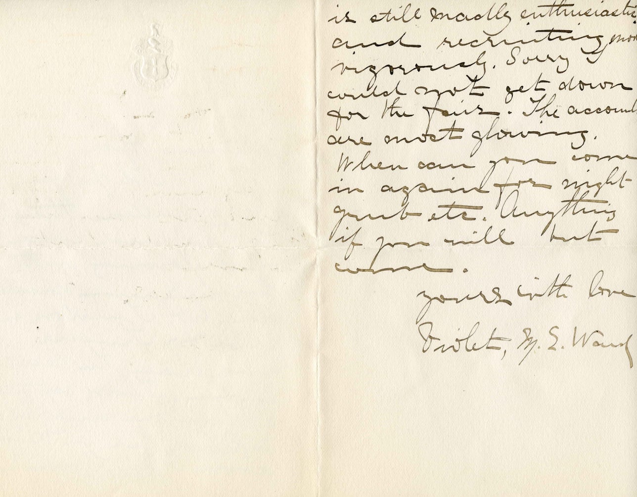 is still madly enthusiastic and recruiting more vigorously. Sorry could not get down for the fair. The accounts are most glowing. When can you come in again for right gunb-etc. Anything if you will but come. Yours with love Violet, S. E. Ward