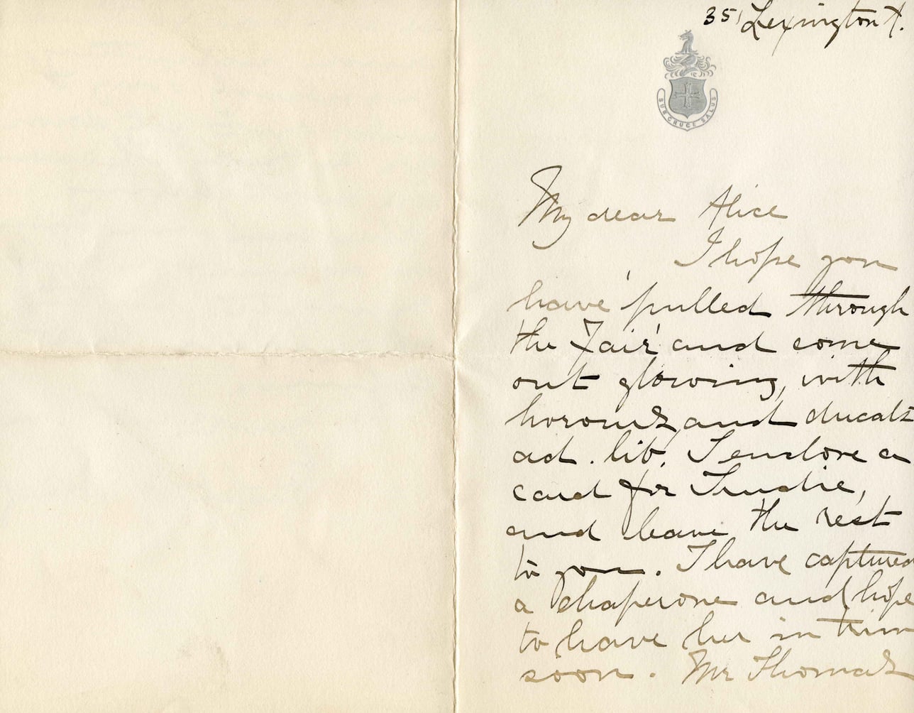 My dear Alice, I hope you have pulled through the Fair and come out glowing, with honour and eclat ad lib. I send you a card for Theatre, and leave the rest to you. I have captured a chaperone and hope to have her in time soon. Mr Thomas