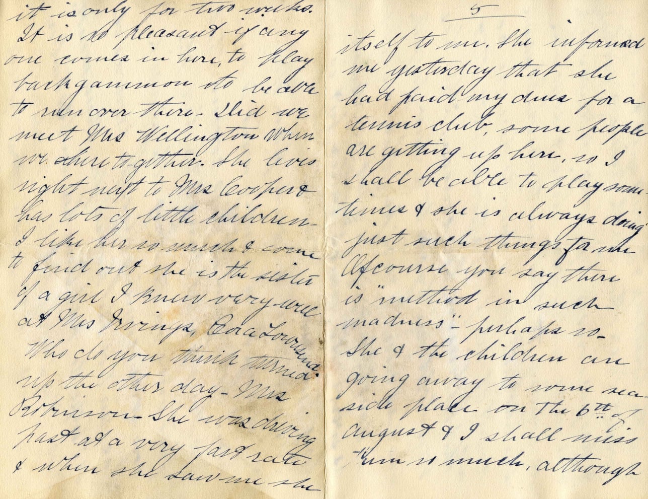 it is only for two weeks. It is so pleasant—if any one comes in here, to play backgammon &c be able to run over there. Did we meet Mrs Wellington when we were together. She lives right next to Mrs Cooper & has lots of little children. I like her so much & come to find out she is the sister of a girl I know very well at Mrs Irving's, Eda Lownes. Who do you think turned up the other day—Mrs Robinson. She was driving past at a very fast rate & when she saw me she itself to me. She informed me yesterday that she had paid my dues for a tennis club; some people are getting up here, so I shall be able to play sometimes & she is always doing just such things for me. Of course you say there is "method in such madness"—perhaps so. She & the children are going away to some seaside place on the 6th of August & I shall miss them so much, although