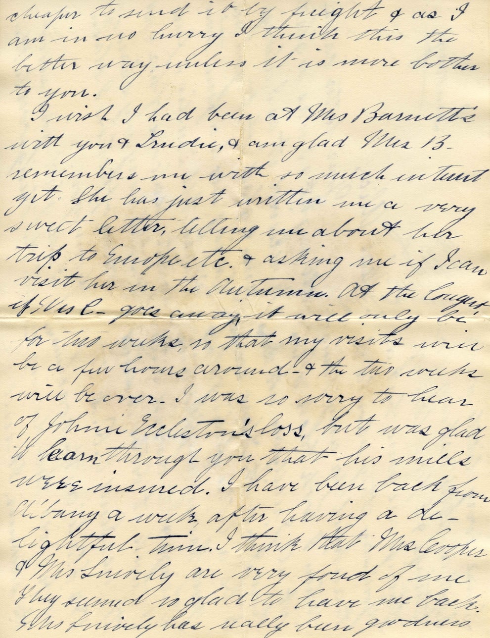 cheaper to send it by freight & as I am in no hurry I think this the better way unless it is more bother to you. I wish I had been at Mrs Barnetts with you & Luridie, & am glad Mrs B. remembers me with so much interest yet. She has just written me a very sweet letter, telling me about her trip to Europe etc. & asking me if I can visit her in the Autumn. At the thought if Mrs C. goes away it will only be for two weeks, so that my visits will be a few hours around & the two weeks will be over. I was so sorry to hear of Johnnie Eccleston's loss, but was glad if learn through you that his mills were insured. I have been back from Albany a week after having a delightful time. I think that Mrs Cothier & Mrs Smively are very fond of me & they seemed so glad to have me back. Mrs Smively has really been goodness
