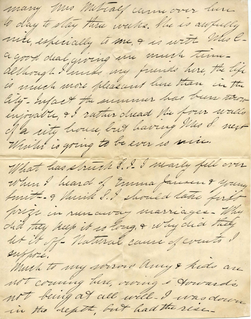Mary Mrs Mitchell came over here today to stay three weeks. She is awfully nice, especially to me, & is with Mrs C— a good deal giving me much time— although I miss my friends here, the life is much more pleasant here than in the city— In fact the summer has been thoroughly enjoyable, & I rather dread the poor walls of a city house, but having Mrs S next winter is going to be ever so nice. What has struck S. I nearly fell over when I heard of Emma Jansen & Young Smith— & think S. I should take first prize in run-away marriages— Why did they keep it so long, & why did they let it off— Natural cause of events I suppose. Much to my sorrow Amy & kids are not coming here, owing to Howard's not being at all well— I was down in the depths, but had the rise—