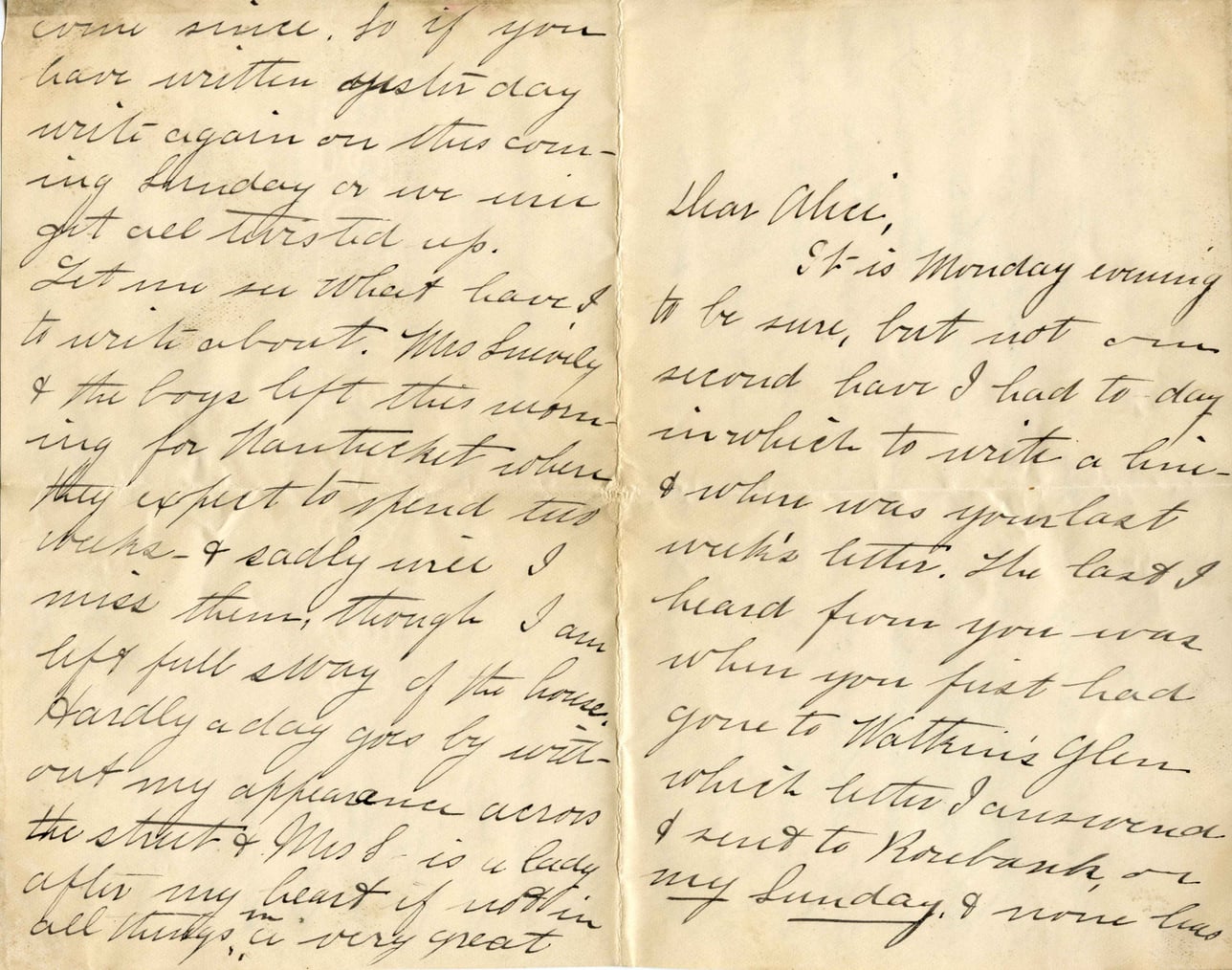 come since. So if you have written yesterday write again on this coming Sunday or we will get all thirsted up. Let me see what I have to write about. Mrs. Emily & the boys left this morning for Nantucket where they expect to spend this week—sadly will I miss them, though I am life full story of the house. Hardly a day goes by without my appearance across the street & Mrs. S. is a lady after my heart if not in all things, it very great. Dear Alice, It is Monday evening to be sure, but not even second have I had today in which to write a line—& when was your last week's letter. The last I heard from you was when you first had gone to Watkins Glen which letter I answered & sent to Robbank, on my Sunday. I now ha