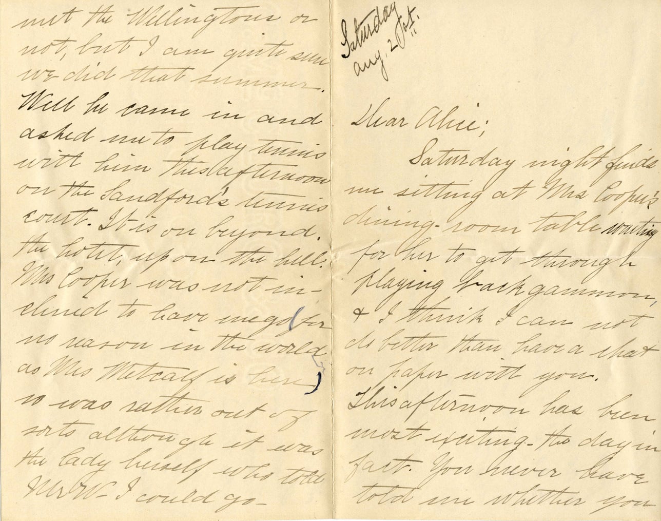 met the Willingtons or not, but I am quite sure we did that summer. Well he came in and asked me to play tennis with him this afternoon on the Sandford's tennis court. It is on beyond the hotel, upon the hill. Mrs Cooper was not inclined to have me go for no reason in the world as Mrs Metcalf is here) so was rather out of sorts although it was the lady herself who told Mr W. I could go. Saturday Aug 2nd Dear Alice; Saturday night finds me sitting at Mrs Cooper's dining-room table waiting for her to get through playing backgammon, & I think I can not do better than have a chat on paper with you. This afternoon has been most exciting—the day in fact. You never have told me whether you