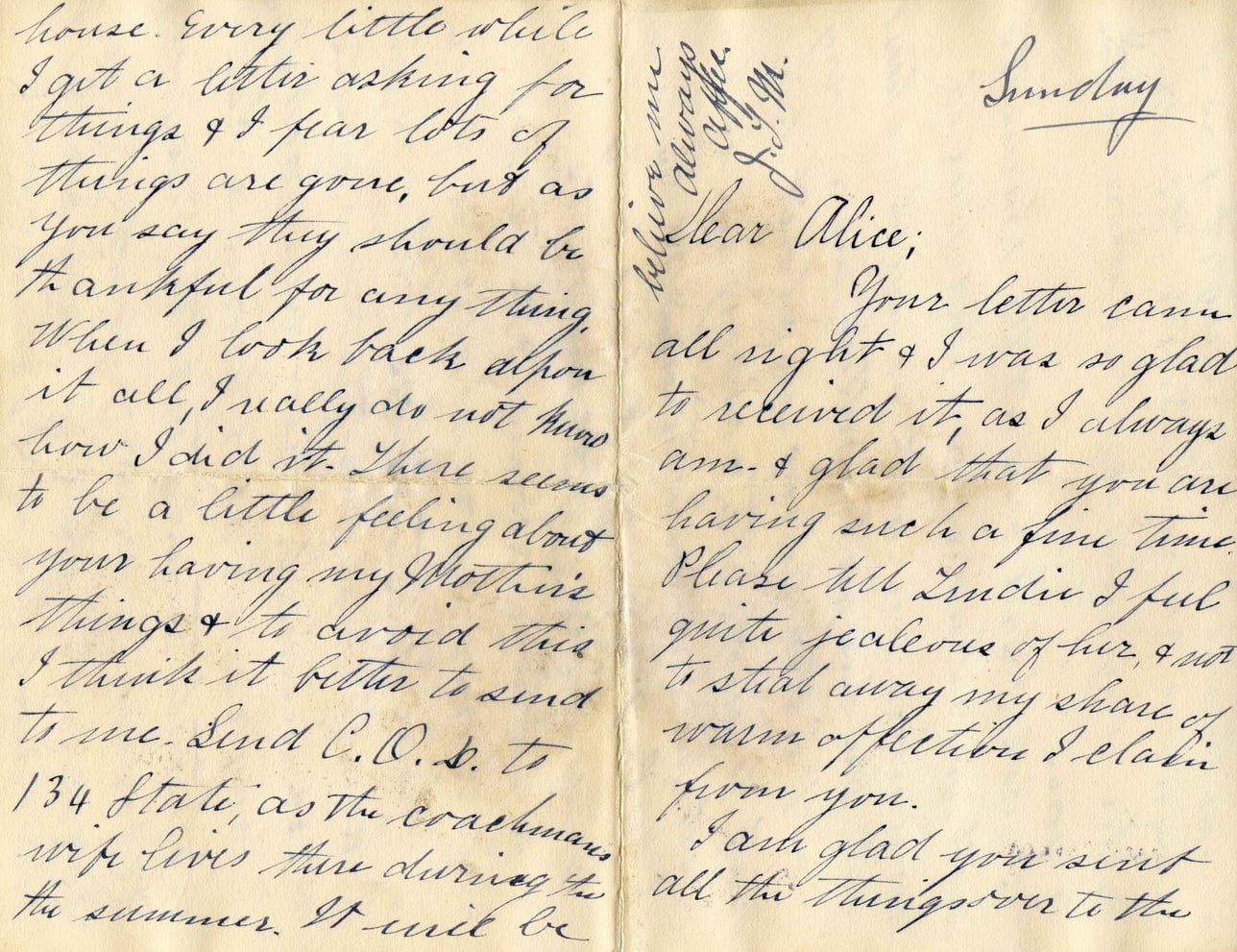 @pinax_collection -> contains -> [@file_1892_7_30_july_6002_martin_copy_jpg, @file_1892_7_30_july_6003_martin_copy_jpg, @file_1892_7_30_july_6004_martin_copy_jpg, @file_1892_7_30_july_6005_martin_copy_jpg, @file_1892_8_2_aug_1002_martin_copy_jpg, @file_1892_8_2_aug_1003_martin_copy_jpg, @file_1892_8_2_aug_1004_martin_copy_jpg, @file_1892_8_22_aug_4004_martin_copy_jpg] {when: @date_1892_07_30, end: @date_1892_08_22}house. Every little while I get a letter asking for things & I fear lots of things are gone, but as you say they should be thankful for anything. When I look back upon it all, I really do not know how I did it. There seems to be a little feeling about your having my Mother's things & to avoid this I think it better to send to me. Send C.O.D. to 134 State, as the coachman's wife lives there during the summer. It will be Sunday Believe me always, L.J.W. Dear Alice; Your letter came all right & I was so glad to received it, as I always am - & glad that you are having such a fine time. Please tell Lindie I feel quite jealous of her, & not to steal away my share of warm affection I claim from you. I am glad you sent all the things over to the