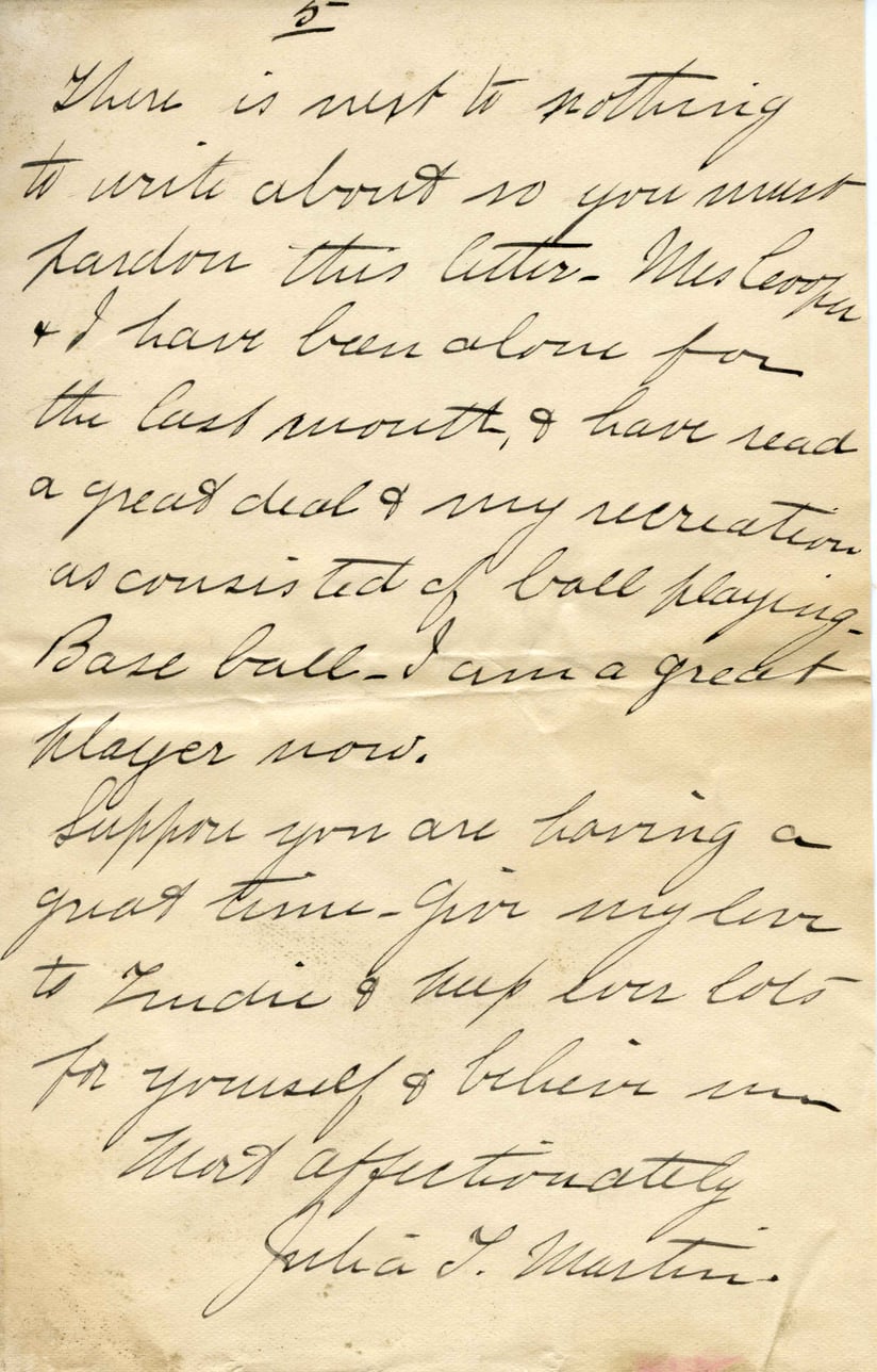 There is not to nothing to write about so you must pardon this letter. Mr. Coop & I have been alone for the last month, & have read a great deal & my recreation as consisted of ball playing. Base ball—I am a great player now. Suppose you are having a great time—give my love to Annie & keep her lots for yourself & believe me Most affectionately Julia T. Martin.
