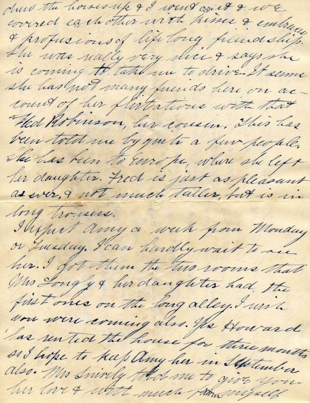 drew the horses up & I went out & we covered each other with kisses & embraces & professions of lifelong friendship. She was really very sick & says she is coming to take me to drive. It seems she has not many friends here on account of her flirtations with that Fred Robinson, her cousin. This has been told me by quite a few people. She has been to Europe, where she left her daughter. Fred is just as pleasant as ever, & not much taller, but is in long trousers. I expect Amy a week from Monday or Tuesday. I can hardly wait to see her. I got them the two rooms that Mrs. Longy & her daughter had, the first ones on the long alley. I wish you were coming also. Yes Howard has rented the house for three months so I hope to keep Amy here in September also. Mrs. Smiley told me to give your her love & with much from myself.