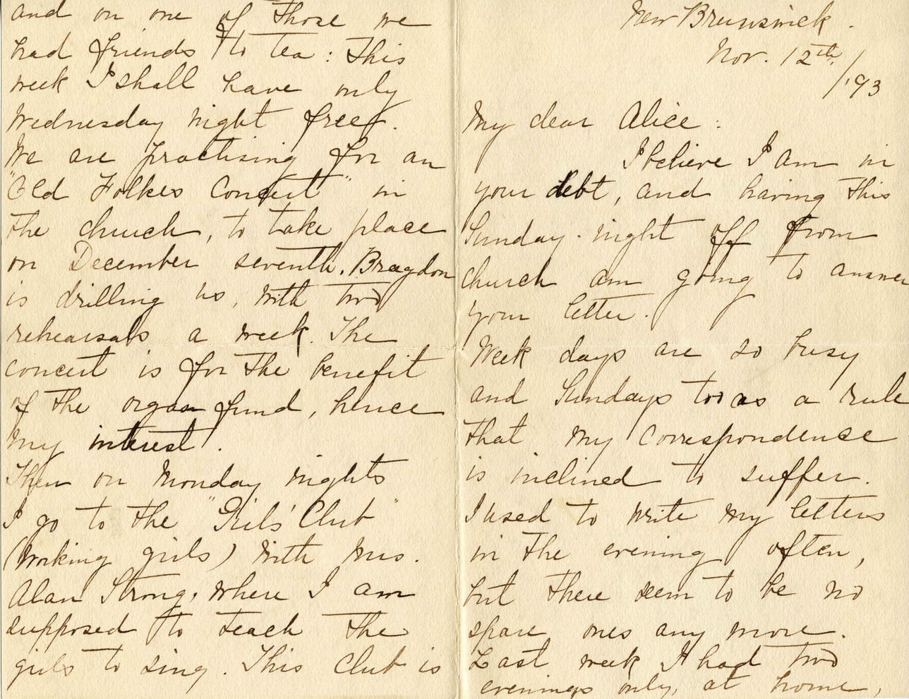 and on one of those we had friends to tea: This week I shall have only Wednesday night free. We are practicing for an "Old Folks Concert" in the church, to take place on December seventh. Braydon is drilling us, with two rehearsals a week. The concert is for the benefit of the organ fund, hence my interest. Then on Monday nights I go to the "Kids' Club" (making girls) with Mrs. Alan Strong, where I am supposed to teach the girls to sing. This club is New Brunswick. Nov. 12th, 1893 My dear Alice: I believe I am in your debt, and having this Sunday night off from church am going to answer your letter. Week days are so busy and Sundays too as a rule that my correspondence is inclined to suffer. I used to write my letters in the evening often, but there seem to be no spare ones any more. Last week I had two evenings only, at home,