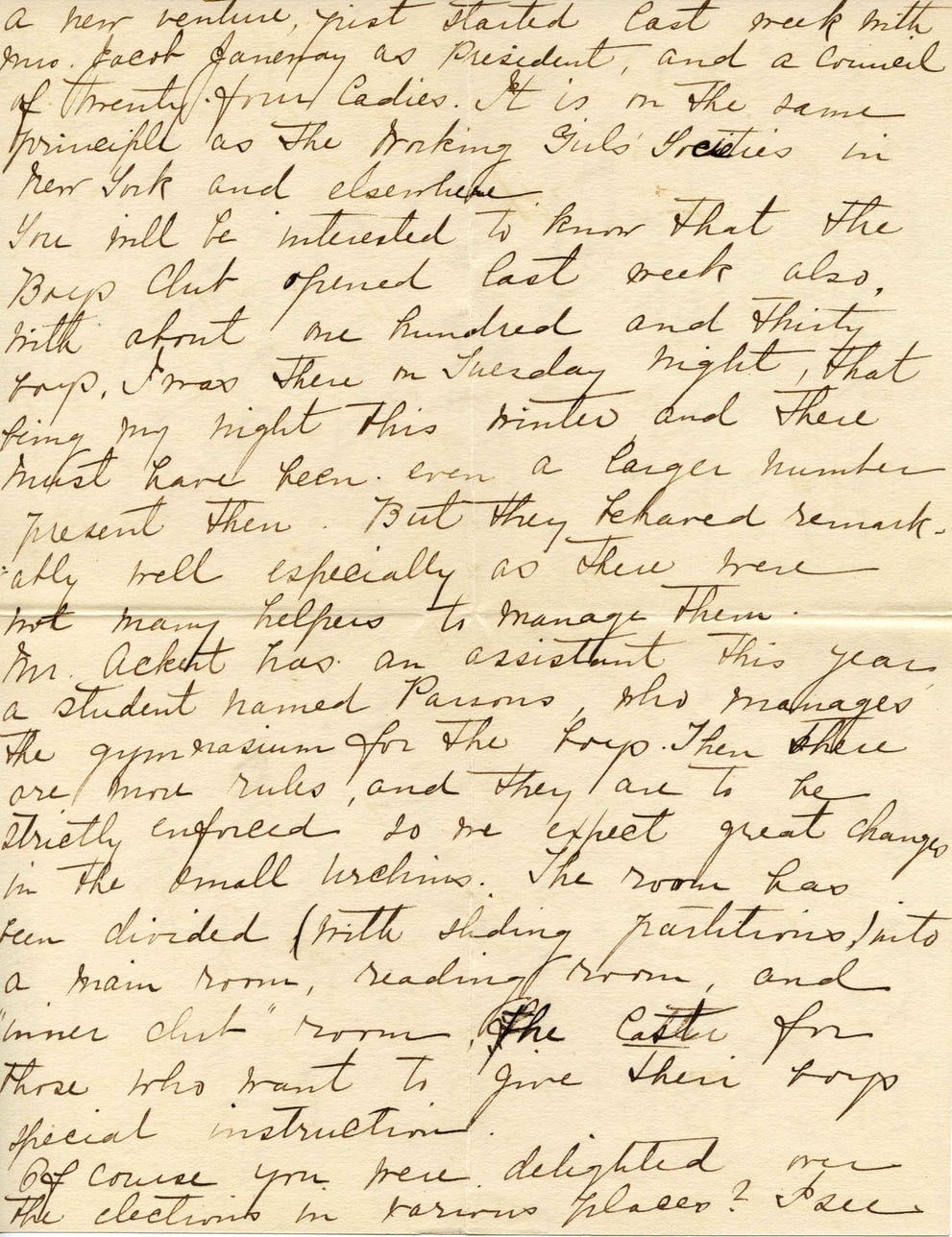 A new venture, just started last week with Mrs. Jacob Janeway as President, and a council of twenty-four ladies. It is on the same principle as the Working Girls' Societies in New York and elsewhere. You will be interested to know that the Boys Club opened last week also, with about one hundred and thirty boys. I was there on Thursday night, that being my night this winter and there must have been even a larger number present then. But they behaved remarkably well especially as there were not many helpers to manage them. Mr. Ackert has an assistant this year, a student named Parsons, who manages the gymnasium for the boys. Then there are more rules, and they are to be strictly enforced so we expect great change in the small urchins. The room has been divided (with sliding partitions) into a main room, reading room, and "inner club" room. The latter for those who want to give their boys special instruction. Of course you were delighted over the elections in various places? I am