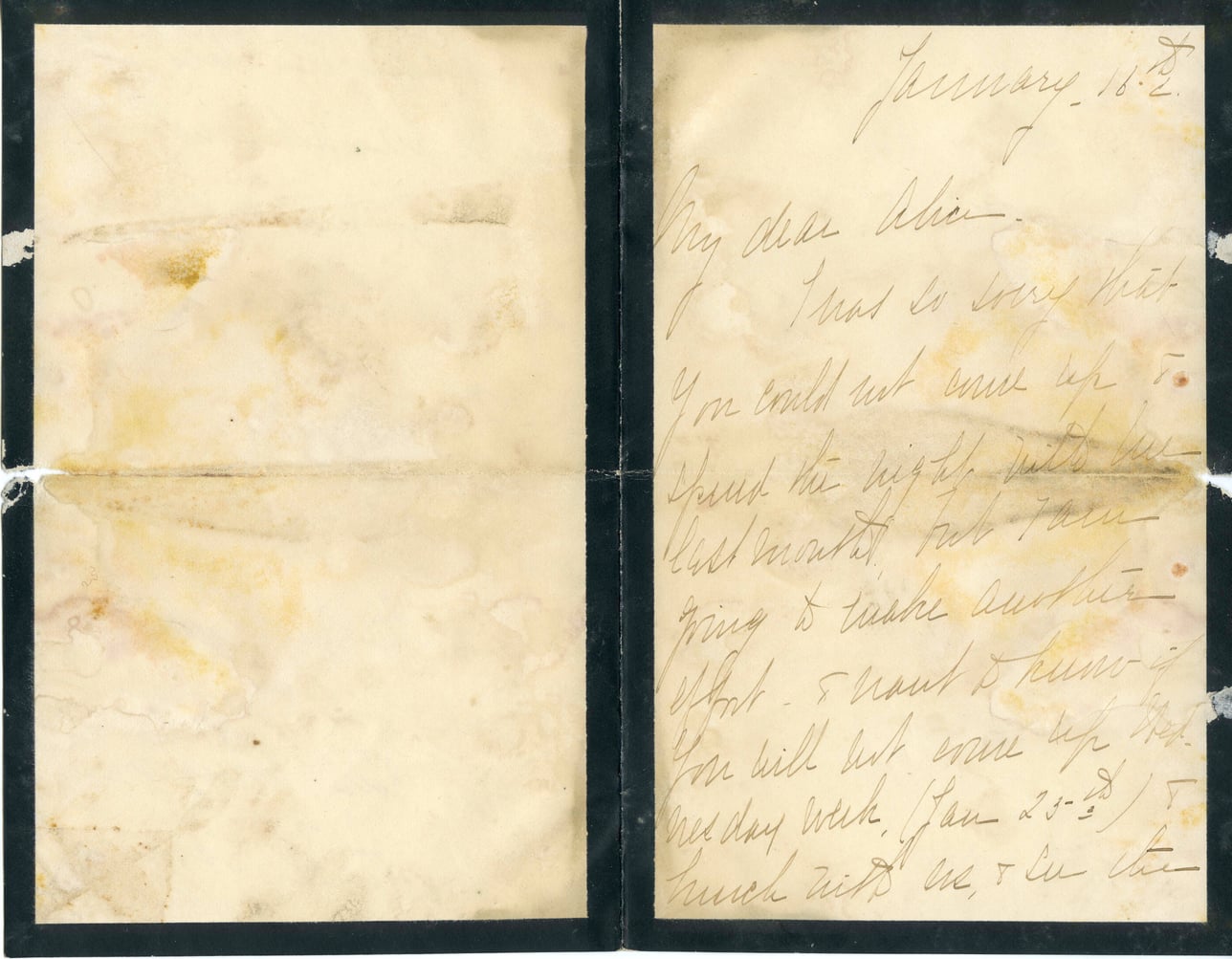 @date_1893_09_01January 18th My dear Alice, I was so sorry that you could not come up to spend the night with us last month, but I am going to make another effort & want to know if you will but come up next Wednesday week. (Jan 25th) & lunch with us, & in the