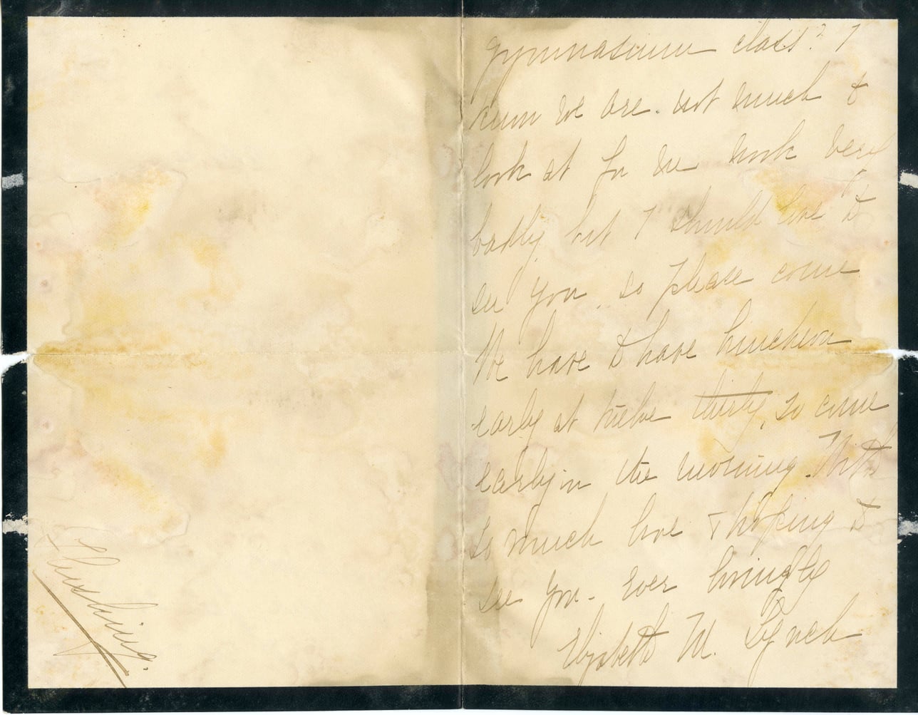 gymnasium class? I know it are not much to look at for we look very badly but I should like to see you, so please come. We have & have hineken early at twelve thirty, so come early in the morning. With so much love & hoping to see you ever lovingly Elizabeth W. Lynch